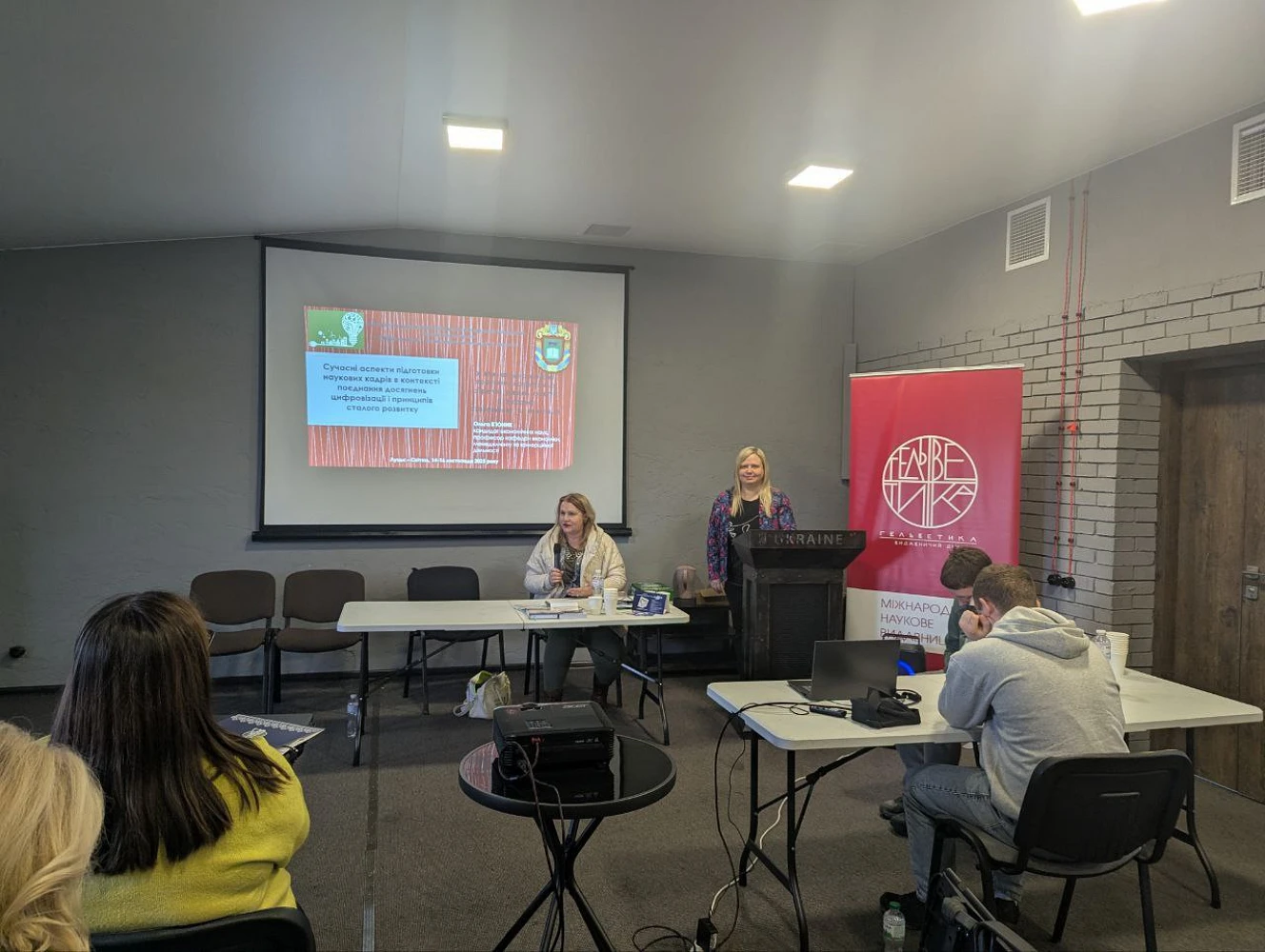 Сучасні аспекти підготовки наукових кадрів в контексті поєднання досягнень цифровізації і принципів сталого розвитку – кіноут-спіч, з яким виступила професор кафедри ЕМКД Ольга В’юник;