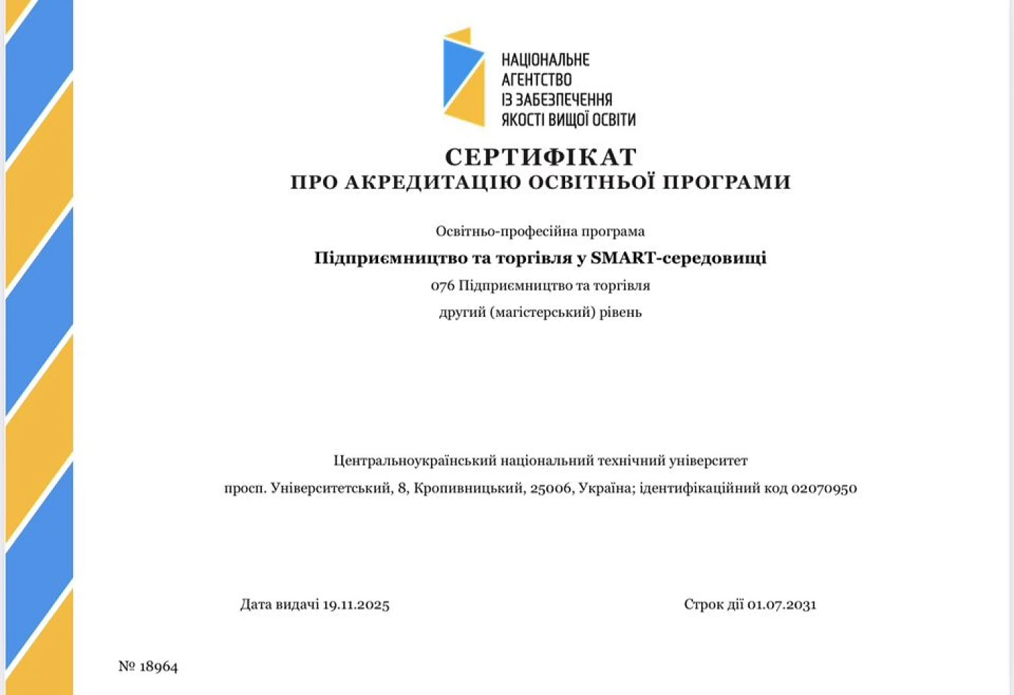 Дата видачі сертифіката — 19.11.2025, строк дії — до 01.07.2031.