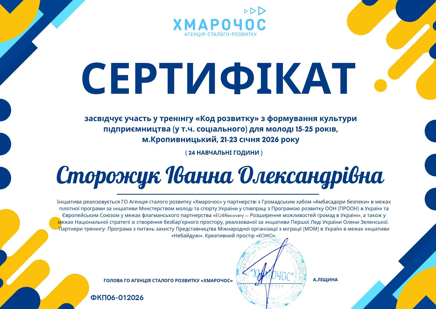21-23 січня 2026 року Агентство сталого розвитку «Хмарочос» у партнерстві із Громадським хабом «Амбасадори безпеки» та відділом молоді та спорту Кропивницької міської ради провели тренінг «Код розвитку» для молоді міста Кропивницького.