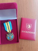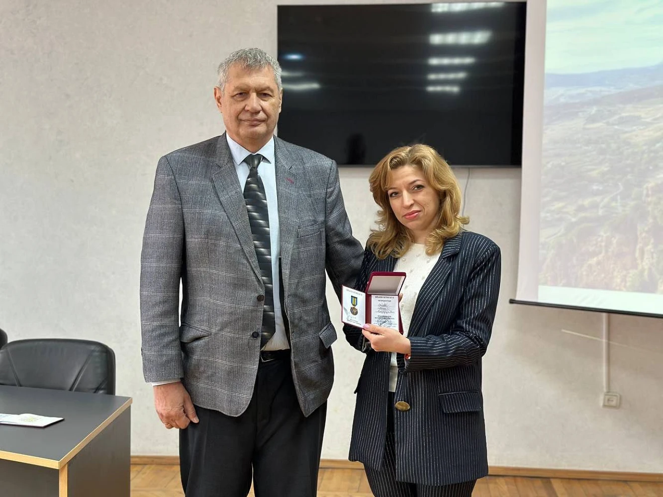 Ректор університету Володимир Миколайович Кропівний вручив доценту кафедри ЕМКД Анна Орлова почесну нагороду від командира 22-ї ОМБр ЗСУ.